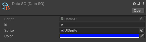 using UnityEngine; [CreateAssetMenu(fileName = "DataSO", menuName = "ScriptableObject/DataSO")] public class DataSO : ScriptableObject { public string id; public Texture2D texture; public Color color; }Test.cs