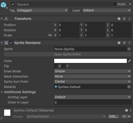 Square라는 Sprite Renderer가 달린 게임오브젝트를 프리팹으로 만듭니다.