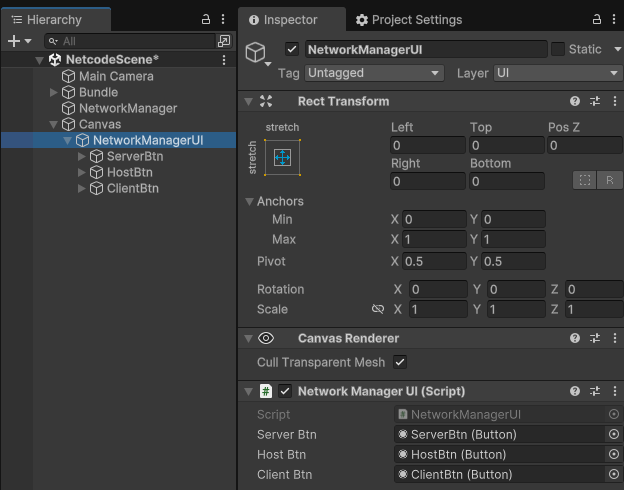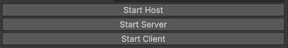 using Unity.Netcode; using UnityEngine; using UnityEngine.UI; using UnityEngine.Events; public class NetworkManagerUI : MonoBehaviour { [SerializeField] Button serverBtn; [SerializeField] Button hostBtn; [SerializeField] Button clientBtn; void Awake() { serverBtn.AddEvent(() => NetworkManager.Singleton.StartServer()); hostBtn.AddEvent(() => NetworkManager.Singleton.StartHost()); clientBtn.AddEvent(() => NetworkManager.Singleton.StartClient()); } } public static class Extension { public static void AddEvent(this Button btn, UnityAction action) { btn.onClick.RemoveAllListeners(); btn.onClick.AddListener(action); } }각각 네트워크 매니저에 있는 서버, 호스트, 클라이언트를 실행하도록 연결합니다.