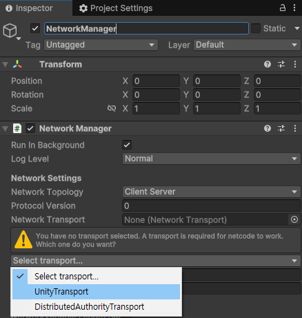 빈 게임오브젝트 NetworkManager라고 이름을 변경하고 NetworkManager 컴포넌트를 넣습니다.