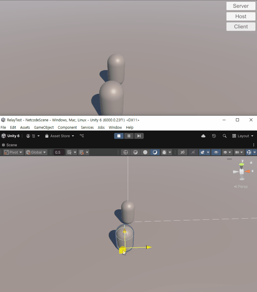 에디터에서 서버겸 클라이언트인 Host로 접속하였고, 빌드한 화면이 Client로 접속했습니다.