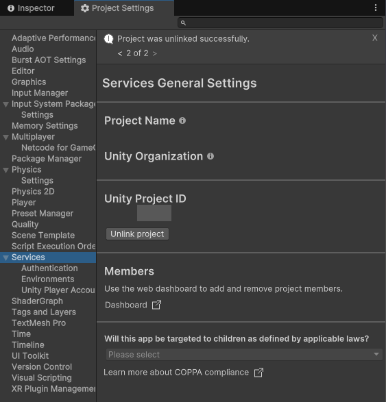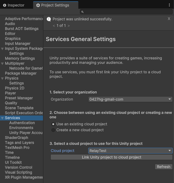 Edit - Project Settings... - Services에서 유니티 클라우드와 프로젝트를 연결합니다.