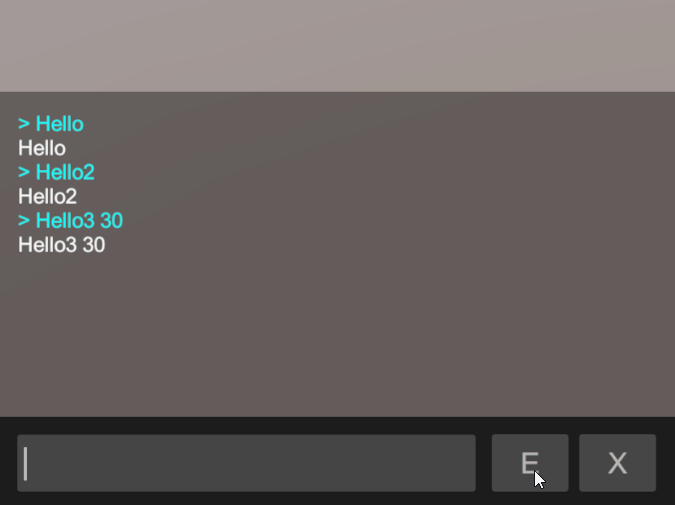 using UnityEngine; using QuickCmd; public class Test : MonoBehaviour { [Command] void Hello() { Debug.Log("Hello"); } [Command] void Hello2() { Debug.Log("Hello2"); } [Command] void Hello3(int num) { Debug.Log($"Hello3 {num}"); } [Command] void MyFunc(int num, string message) { Debug.Log($"MyFunc {num} {message}"); } void Update() { if (Input.GetKeyDown(KeyCode.Alpha7)) { QuickCommand.SendWatch("num", Random.Range(0, 100)); } else if (Input.GetKeyDown(KeyCode.Alpha8)) { QuickCommand.SendWatch("myVec", Random.insideUnitSphere); } else if (Input.GetKey(KeyCode.Alpha9)) { QuickCommand.SendWatch("time", Time.time); } } }씬에 하나만 존재하는 스크립트에 함수 명령어가 가능합니다.