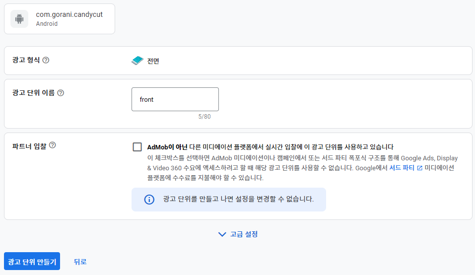 애드몹 사이트 앱 탭에서 본인의 앱을 선택하고 앱 설정에 들어갑니다.