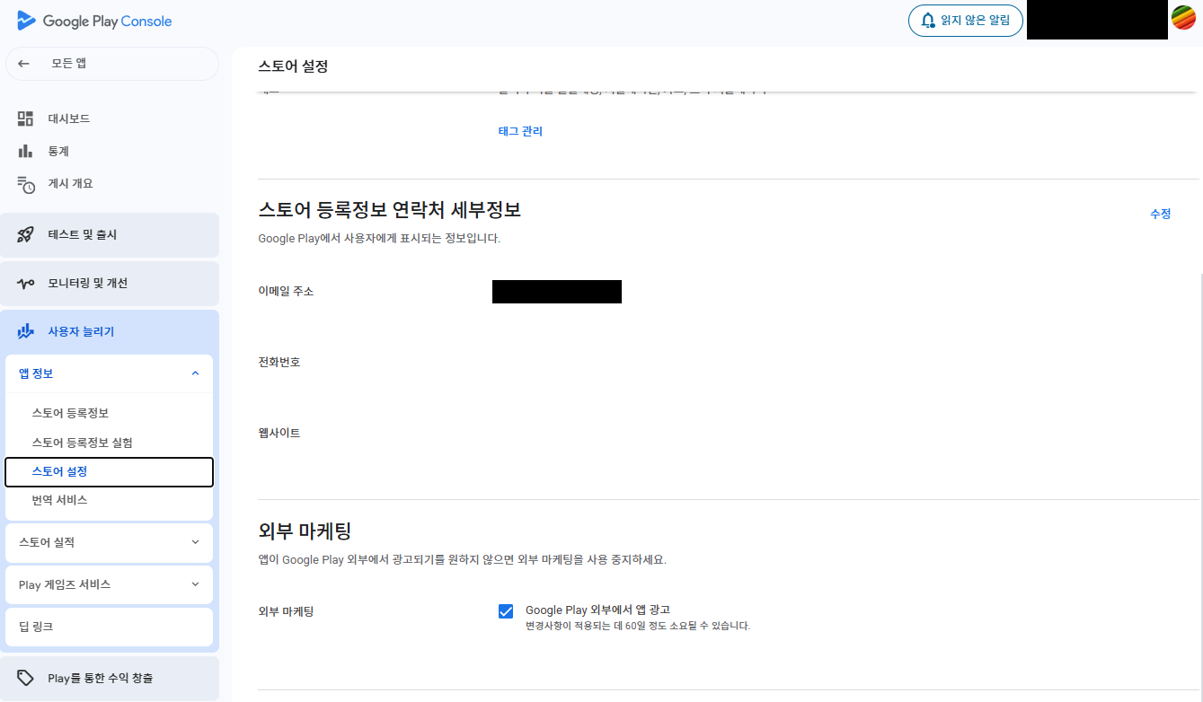 구글 플레이 콘솔 - 출시된 앱을 누르고 사용자늘리기 - 앱 정보 - 스토어 설정 클릭